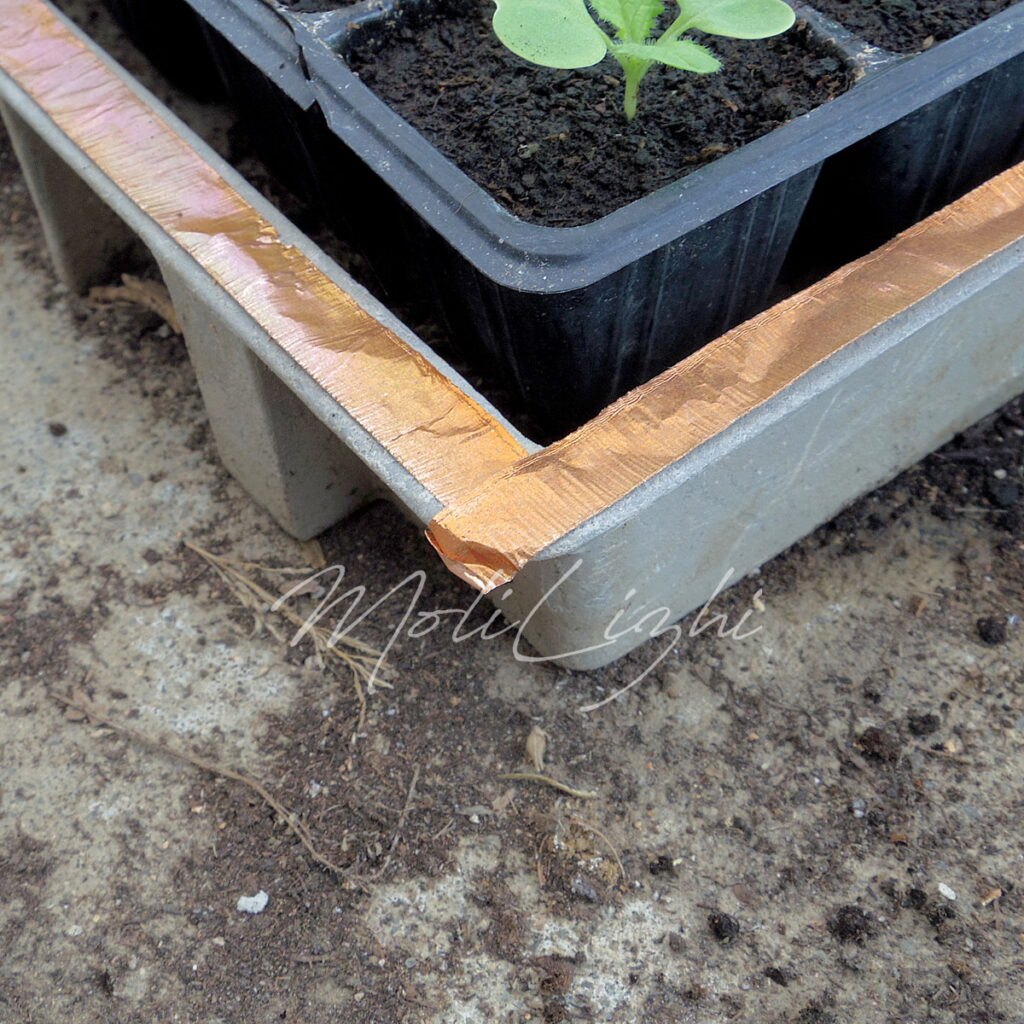 苗トレーの周りにぐるっと貼ると、カタツムリは苗トレーにたどり着けず、下に潜って朝を迎えるだけ。